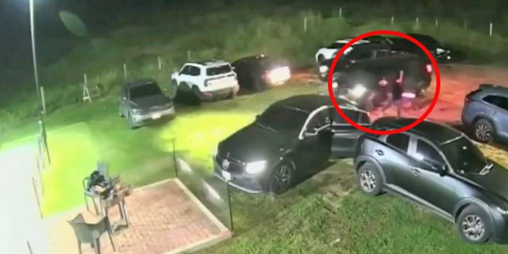 Imáganes de la cámara de seguridad del lugar, muestran la llegada de dos vehículos del que descienden cuatro sujetos que son los que acribillan al joven disparándole en diferentes partes del cuerpo.