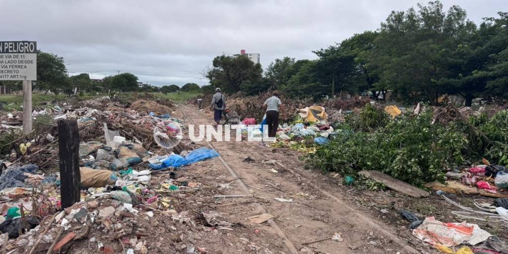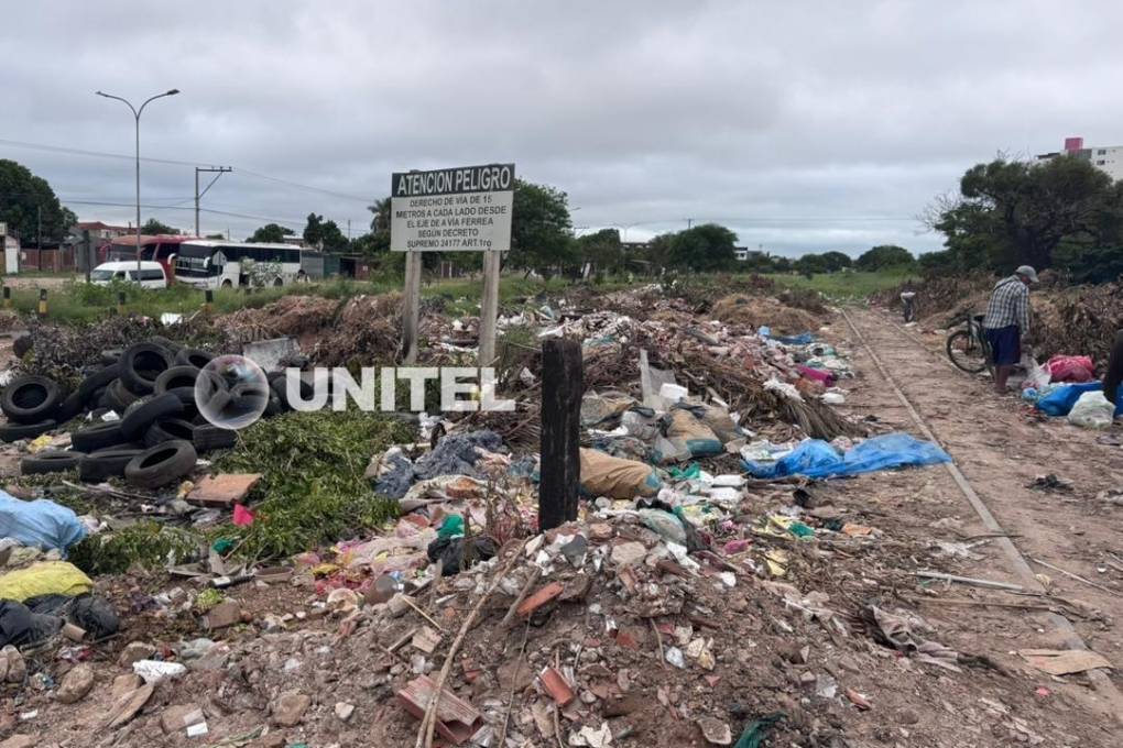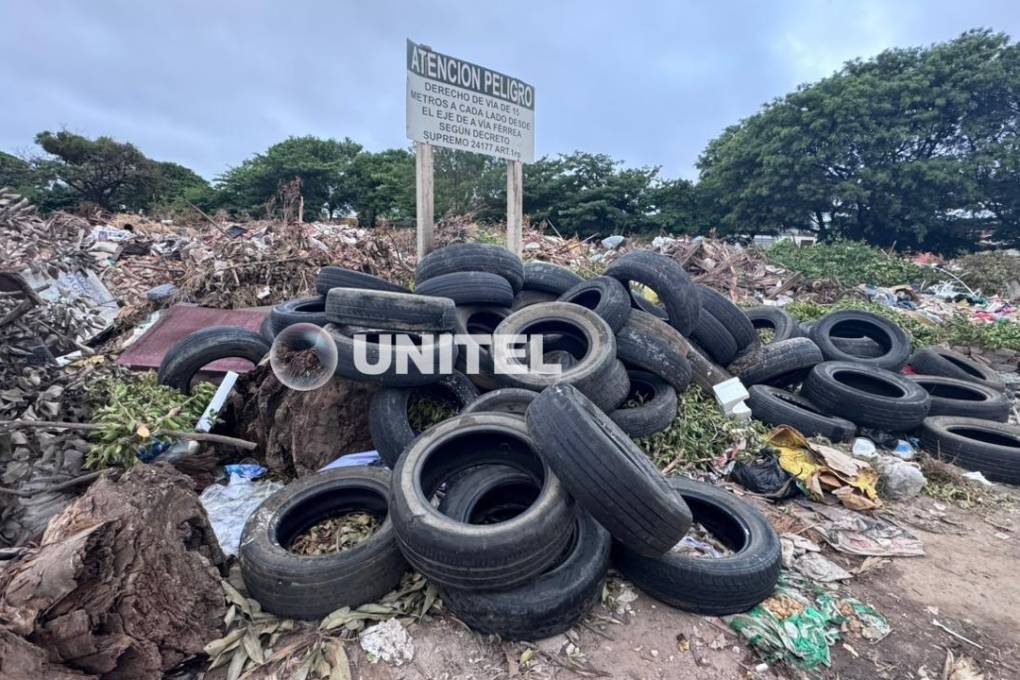 El basural está a los costados de las rieles del tren. Además, por un costado pasa un vehículo.