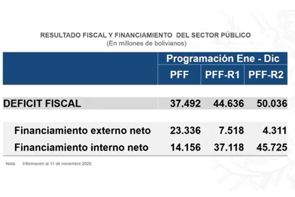 La autoridad remarcó que la proyección original de financiamiento externo, de Bs 23.336 millones, no se cumplió y cayó a Bs 4.311 millones, mientras que la necesidad de financiamiento interno se elevó de Bs 14.156 millones a Bs 45.725 millones para cerrar el año.