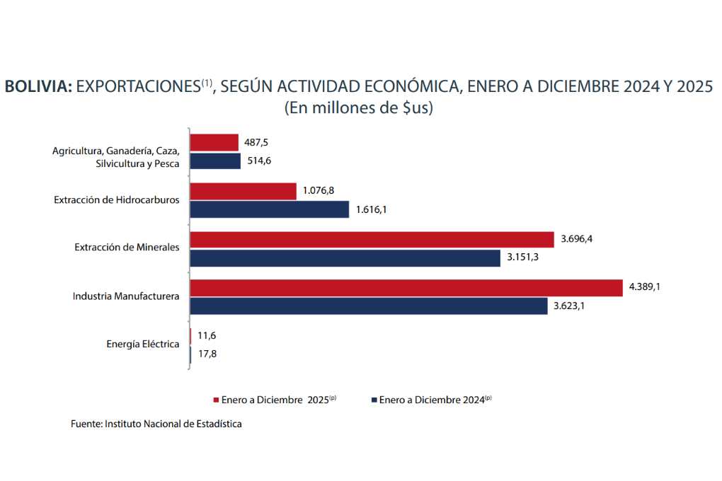 El reporte muestra que las exportaciones de minerales y de la industria manufacturera muestran un repunte, ya que en 2025 alcanzaron los $us 3.696,4 millones y $us 4.389,1 millones, respectivamente. Mientras que en 2024 la cifra llegó a $us 3.151,3 millones y $us 3.623,1 millones, respectivamente.