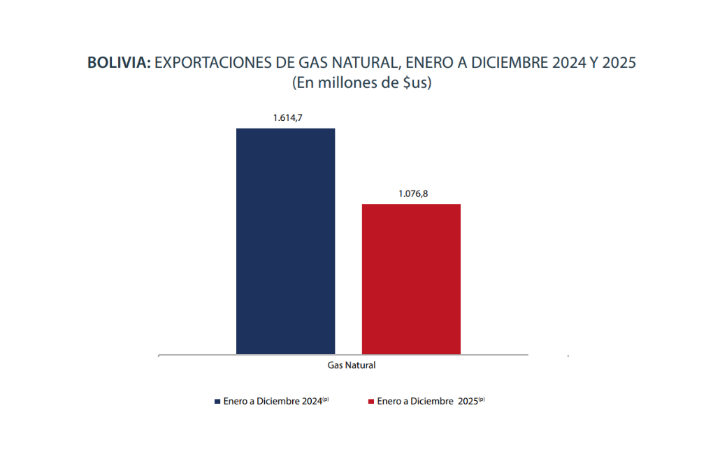 El informe refleja que, en el año 2025, las exportaciones del hidrocarburo alcanzaron los $us 1.076,8 millones, mientras que en el periodo 2024 la cifra fue de $us 1.614,7 millones, es decir, hay una caída en torno al 33%.