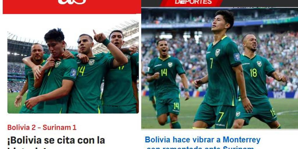 “Bolivia hace vibrar a Monterrey con remontada ante Surinam”. “Bolivia sueña con el Mundial”. “Miguelito pide cita para el Mundial”. Estos son algunos titulares que dejan medios de comunicación especializados en deportes tras la victoria de la Verde en el primer duelo del repechaje mundialista.