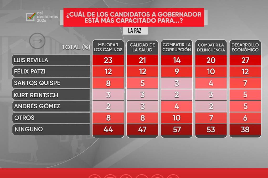 En la categoría “ninguno”, el 44% señala que ningún candidato está en capacidad de mejorar los caminos; el 47% indica que no puede solucionar la calidad de la salud; el 57% considera que no puede combatir la corrupción; el 53%, la delincuencia; y el 38% afirma que no está en capacidad de impulsar el desarrollo económico.
