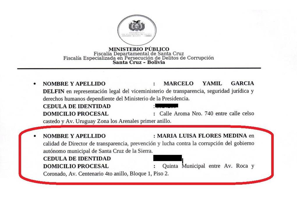 En la imputación de la Fiscalía, figura como denunciante la directora de Transparencia, Prevención y Lucha contra la Corrupción del Gobierno municipal de Santa Cruz de la Sierrа