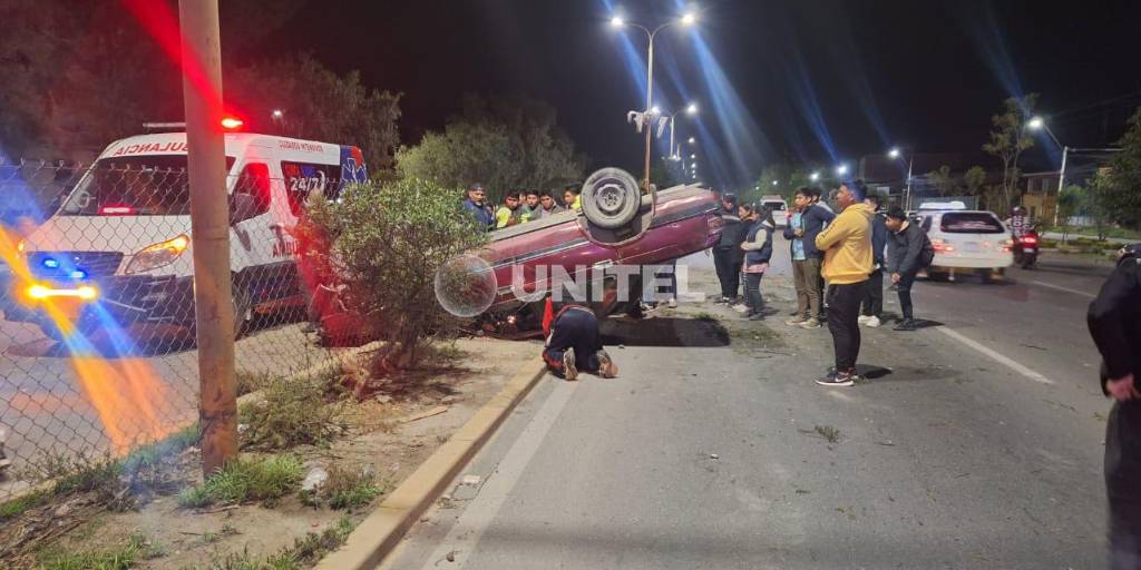 Un aparatoso accidente de tránsito se registró la madrugada de este jueves luego de que un vehículo particular volcara y quedara sobre la jardinera central de la avenida Blanco Galindo, en Cochabamba.