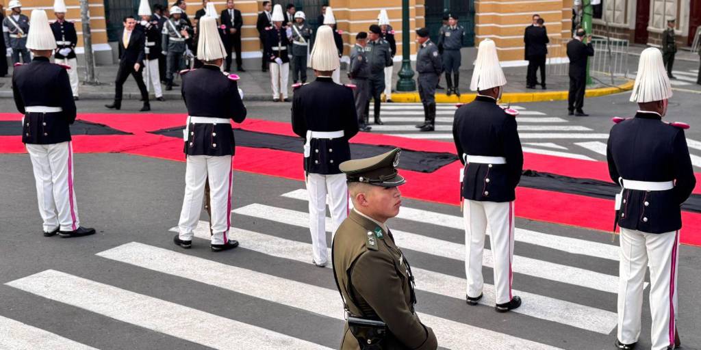 En el frontis del Palacio Quemado flamean tres banderas tricolor y alrededor de la plaza Murillo hay personal de seguridad. Poco antes de las 9:00 comenzaron a llegar las delegaciones internacionales que fueron recibidos por militares de las Fuerzas Armadas.
