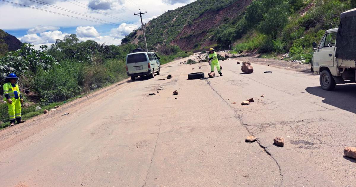 [Foto: UNITEL] / Personal de la ABC impia la carretera a occidente desde Cochabamba que estaba llena de piedras.