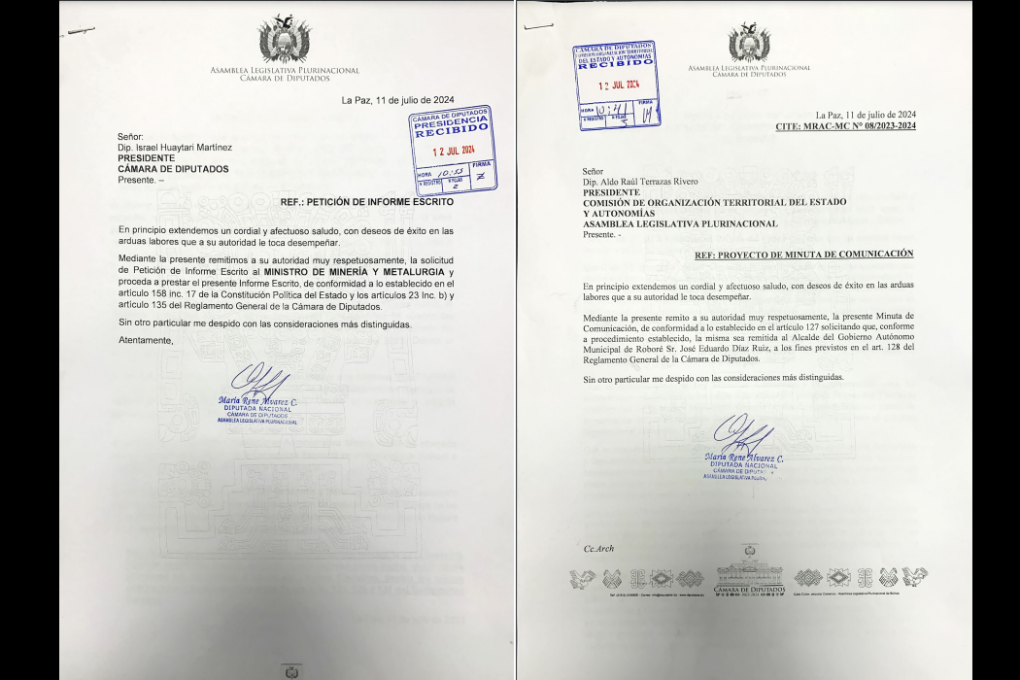 Aún no hay un pronunciamiento al respecto de la entidad estatal, pero la parlamentaria sostuvo que la misma dio paso a la solicitud de licencia de prospección y exploración que hizo una empresa en fecha 8 de agosto de 2023, para actuar sobre un espacio que no solo alcanza al territorio de tres comunidades, sino también a la Unidad de Conservación de Patrimonio Natural (UCPN) de Tucabaca.