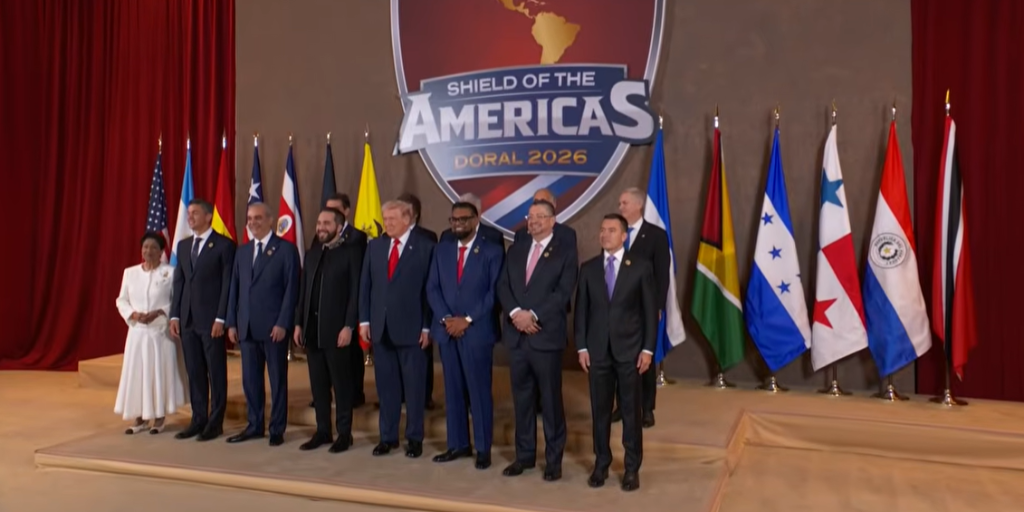 La reunión, bautizada como ‘Escudo de las Américas’, se celebra en el Trump National Doral Miami, un resort con campo de golf propiedad del mandatario, y busca consolidar el liderazgo de Washington en América Latina y contrarrestar la creciente influencia de China en la región.