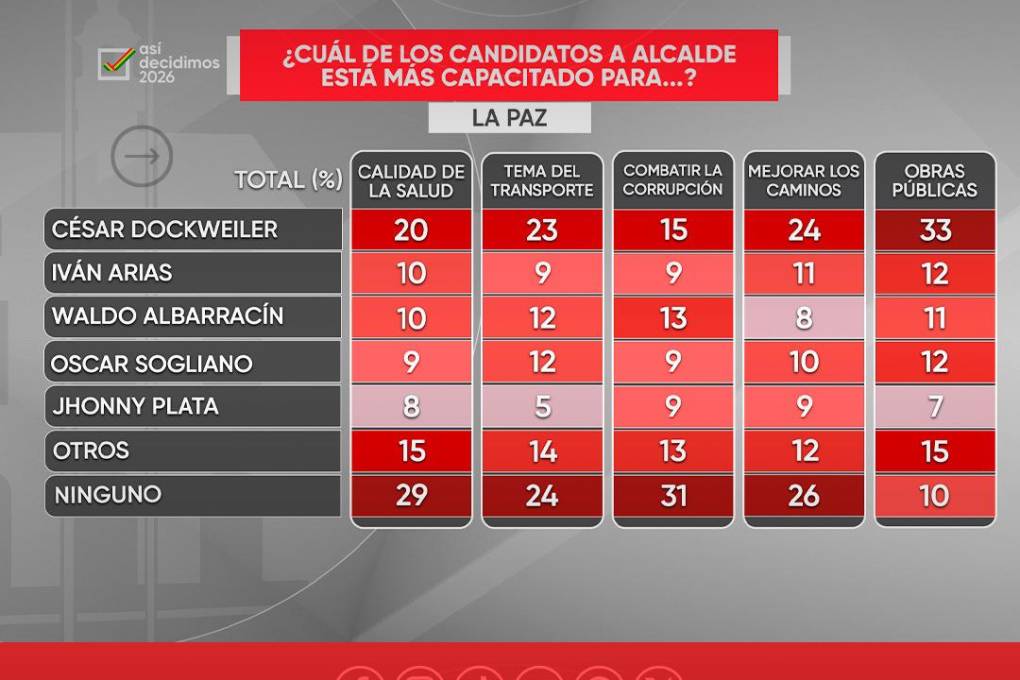Además, la encuesta de intención de voto presentada la noche del jueves, indica que, en el caso de los aspirantes a la Alcaldía de La Paz, el candidato de Innovación Humana (IH), César Dockweiler, se ubica en primer lugar con 21.6%, seguido por Waldo Albarracín, de Venceremos, con 11.9%. En tercer lugar se encuentra Óscar Sogliano, de APB – Súmate, con 11.7%.
