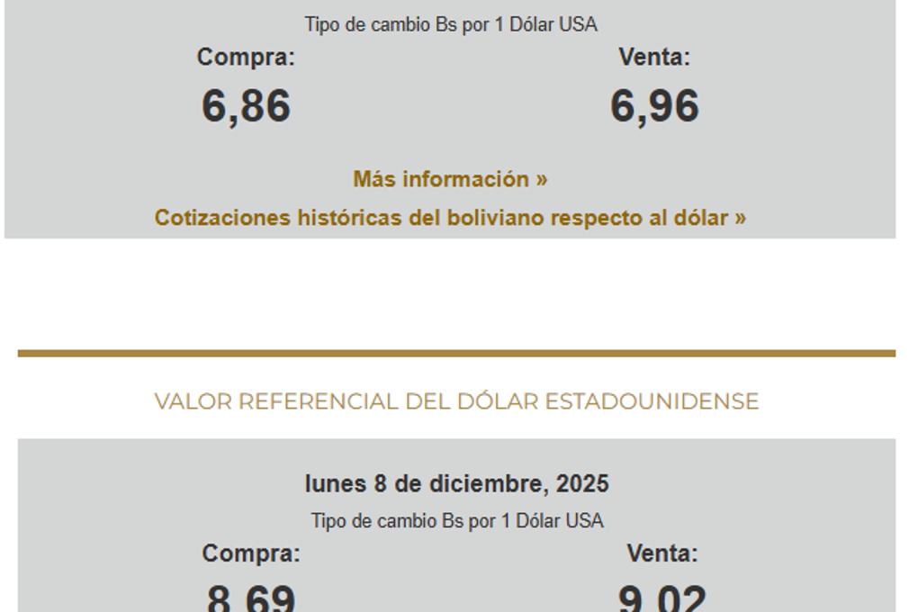 El Banco Central de Bolivia (BCB) difunde de forma diaria el valor referencial del dólar estadounidense con base en las operaciones efectivas entre las entidades financieras y sus clientes.
