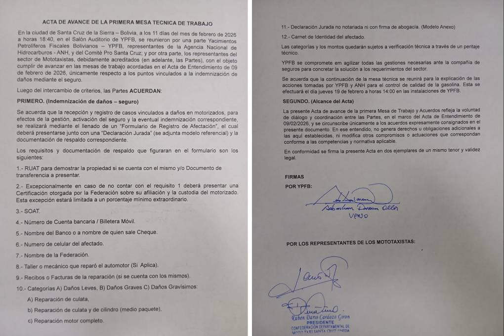 El acta de avance de la primera mesa técnica de trabajo, que se realizó en Santa Cruz, estableció una serie de parámetros para que los mototaxistas accedan a esta compensación económica