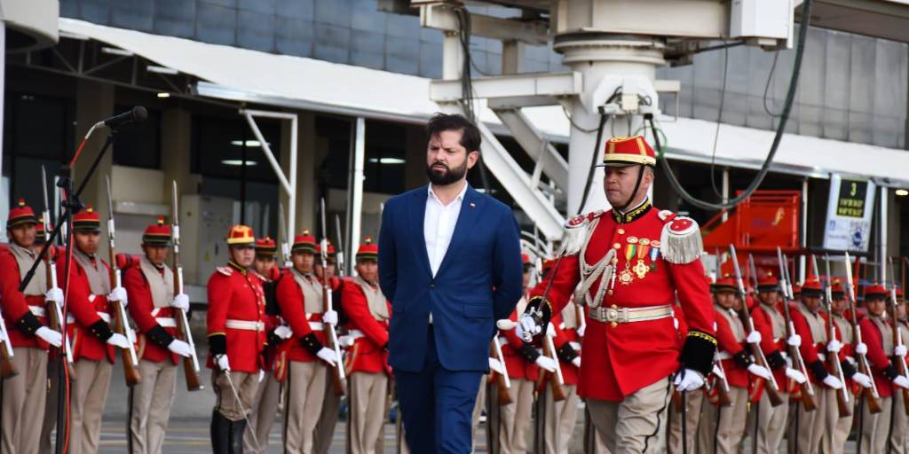 Boric llegó cerca de las 17:50 en una aeronave de la Fuerza Aérea de Chile, con una comitiva de alto nivel y junto a su canciller Gloria de la Fuente.