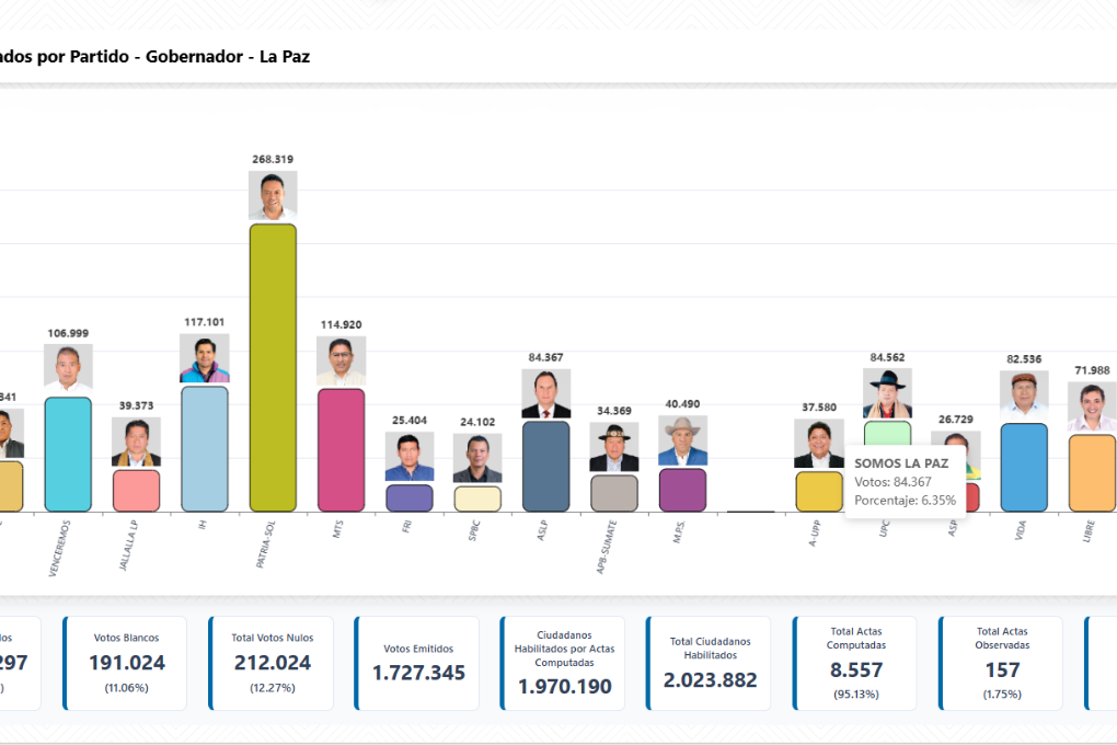 Este resultado no es oficial puesto que el Tribunal Supremo Electoral (TSE) se hace cargo del cómputo de votos de La Paz, que tienen un avance lento.