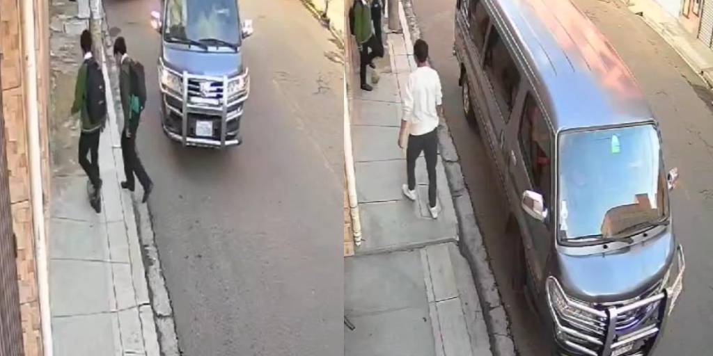 En las imágenes se observa que el agresor bajó de un minibús de color plomo y se dirigió directamente a uno de los menores de edad, lo tomó del cuello y lo tumbó al piso para golpearlo.