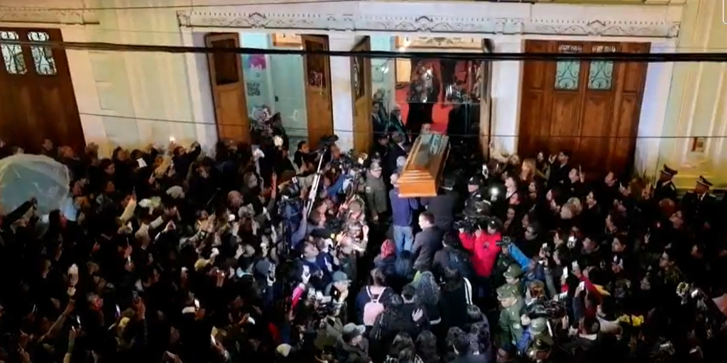 [Foto: Captura de BTV] / El féretro de David Santalla ingresa en el Teatro Municipal de La Paz.