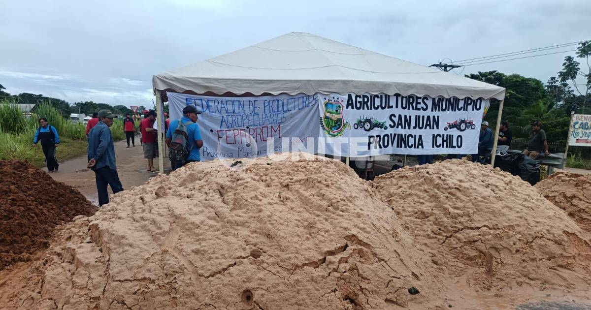 El bloqueo que se registra en la ruta nueva es protagonizado por agricultores arroceros y soyeros de la provincia Ichilo, quienes exigen la abrogación del Decreto Supremo 5547, con el cual el Gobierno aprobó “arancel cero” para la importación de granos de soya.