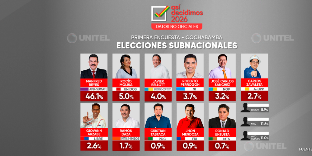 Unitel presentó la noche de este jueves la primera encuesta de intención de voto rumbo a las elecciones subnacionales 2026