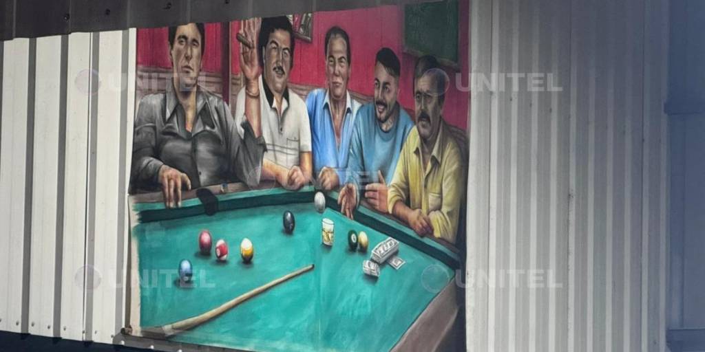En uno de los allanamientos realizados en la zona del Urubó, las autoridades encontraron una peculiar cuadro dentro de un galpón, en el que se ve una imagen de Marset pintada junto a otras figuras vinculadas con la cultura narco y de mafia.