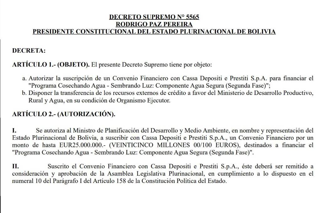 El gobierno de Rodrigo Paz, a través del Decreto Supremo 5565, autorizó al Ministerio de Planificación del Desarrollo y Medio Ambiente suscribir un “convenio financiero” con la institución financiera italiana Cassa Depositi e Prestiti S.p.A., por un monto de hasta 25 millones de euros.