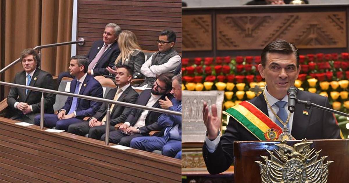 El presidente de Argentina Javier Milei, el chileno Gabriel Boric, el ecuatoriano Daniel Noboa, el paraguayo Santiago Peña y el uruguayo Yamandú Orsi, asistieron a la posesión presidencial en Bolivia