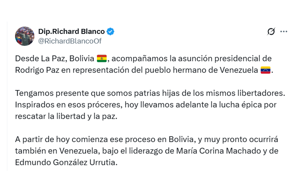 El venezolano presente en la ceremonia de toma de mando del presidente boliviano Rodrigo Paz fue Richard Blanco, diputado de la Asamblea Nacional y dirigente del partido Alianza Bravo Pueblo, integrante de la coalición opositora Soy Venezuela.
