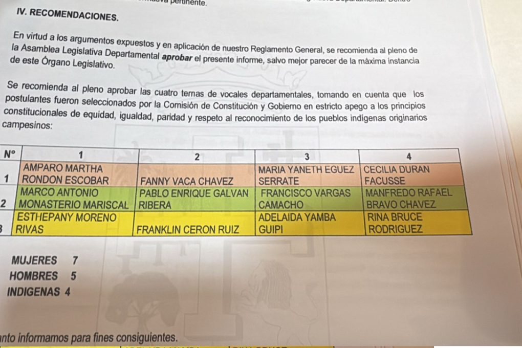 El pleno de la ALD instaló una sesión la tarde de este viernes para analizar el tema y, en caso de aprobación, la lista de los 12 postulantes será remitida a la Asamblea Legislativa Plurinacional, según el reporte de la Comisión.