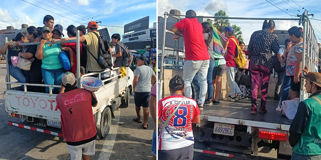 El equipo de UNITEL llegó hasta el primer anillo y avenida Grigotá, en la zona del mercado La Ramada, desde donde salen las camionetas a diferentes barrios. Los vecinos suben de pie en la parte de atrás y se tienen que acomodar como pueden.