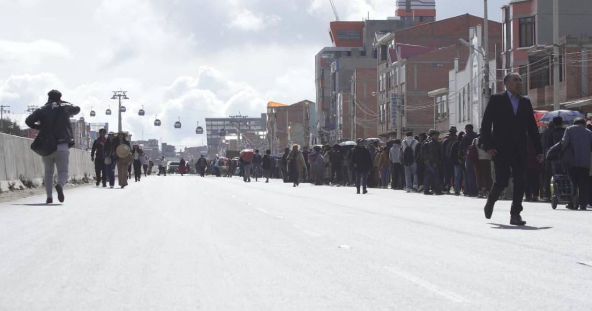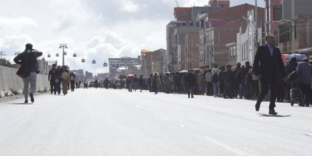 Los puntos de bloqueo en las ciudades de La Paz y El Alto obligaron a las personas a desplazarse a pie por calles y avenidas. Ante este panorama, se registraron filas en las estaciones del teleférico.