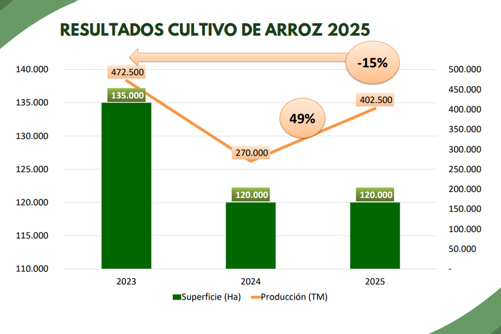 El cultivo de arroz en 2025 registra un área sembrada de 120.000 hectáreas, similar a la superficie de la gestión 2024 y una reducción de 11,11% comparado con el área sembrada en 2023.
