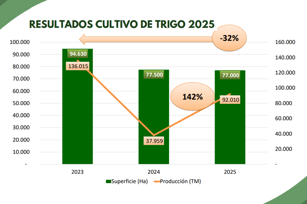 El área cultivada de trigo en la gestión 2025 fue de 77.000 hectáreas, una reducción de 0,65% comparado con la superficie sembrada en la gestión 2024 y un 18,63% comparado con la gestión 2023.