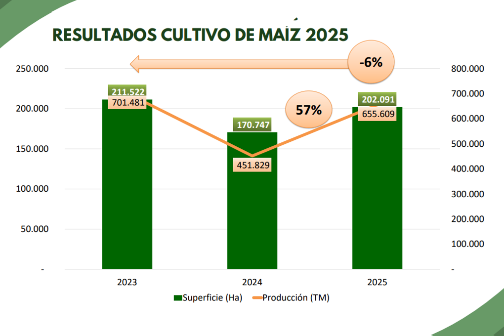 En la gestión 2025, la producción consolidada de maíz fue de 655.609 toneladas, registrando un aumento de un 45%, comparado con la gestión 2024 y una reducción de 7% comparado con la gestión 2023, es decir que la producción se ubicó por debajo de los niveles alcanzados en 2023.