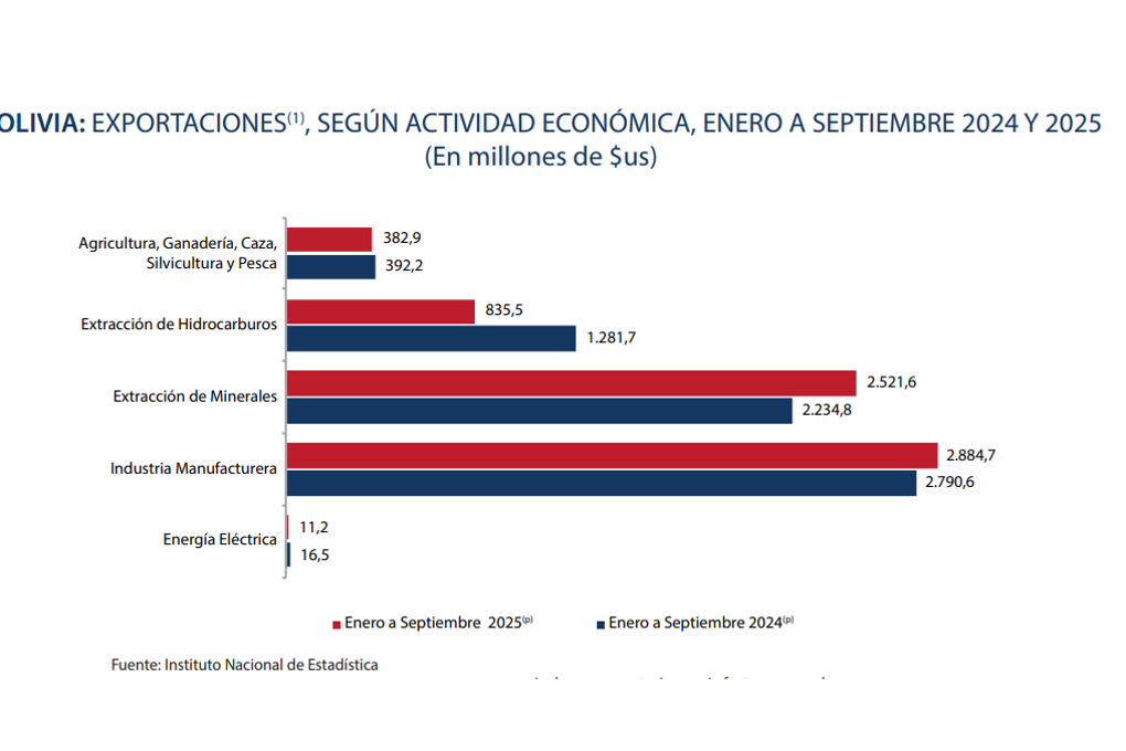 Mientras que en el sector energético, la exportación de gas también refleja una caída, si se toma en cuenta que de enero a septiembre de 2025 se exportó un total de $us 835,5 millones, a diferencia de los $us 1.281,7 millones del mismo periodo de 2024.