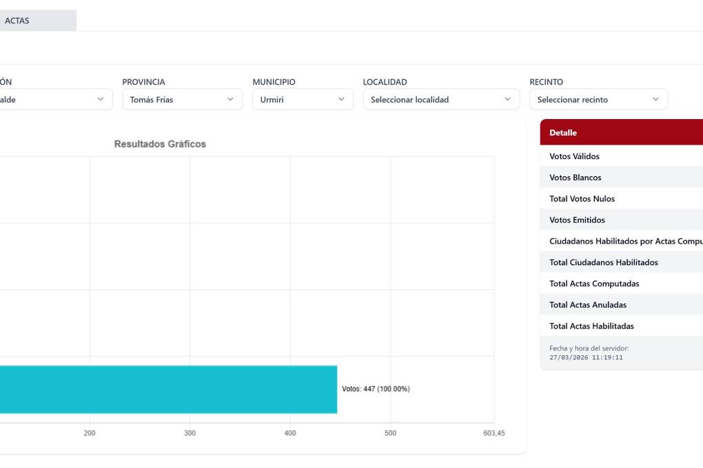 Según el cómputo oficial de las actas de los comicios en esta región, el único candidato habilitado era Widne Walter Amaru Visa, de la Alianza Patria Oruro, que sumó 157 votos, lo que representa el 100% del respaldo electoral.