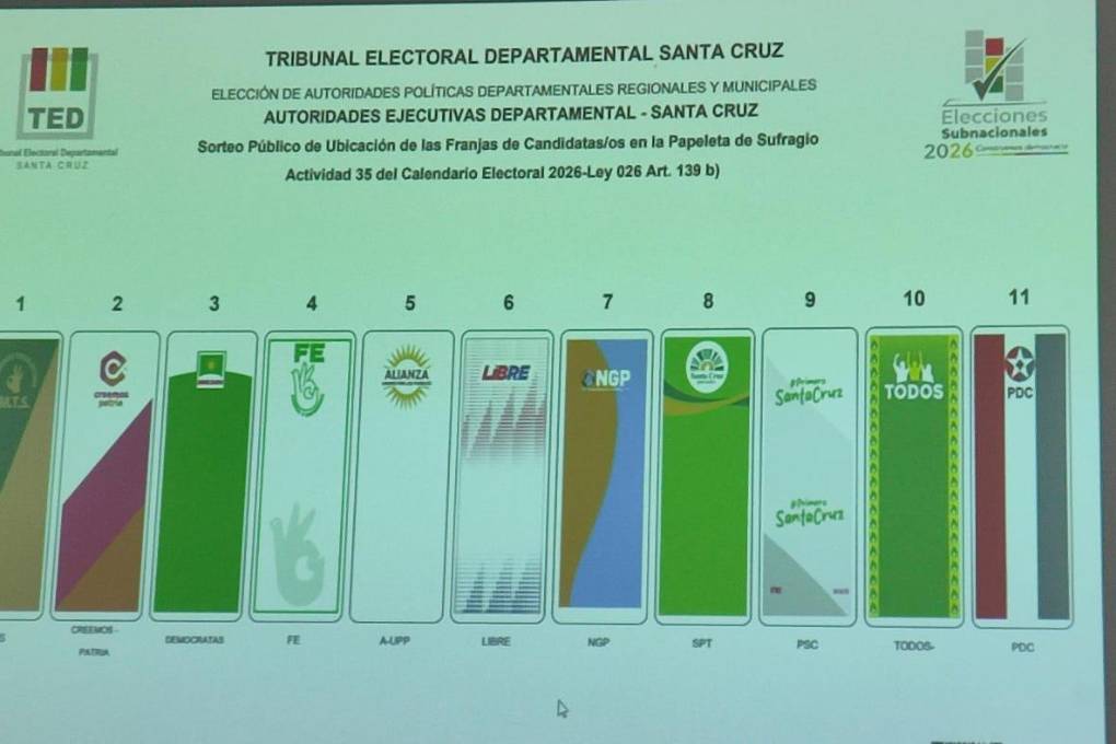 El Tribunal Electoral Departamental (TED) realizó el sorteo para la ubicación en la papeleta de las agrupaciones que disputarán la Gobernación de Santa Cruz. El 22 de marzo está fijado como el día de la votación para las subnacionales.