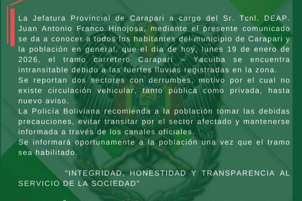La Jefatura Provincial de Caraparí informó que el tramo carretero Caraparí – Yacuiba se encuentra “totalmente intransitable”, a consecuencia de las intensas lluvias registradas en la zona durante las últimas horas.