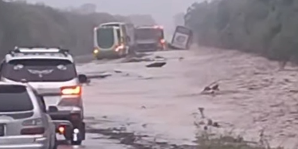 Pasajeros reportan largas filas de vehículos de alto tonelaje y flotas varadas debido a la acumulación de agua sobre la capa asfáltica, situación que fue evidenciada en diversos videos publicados en redes sociales que muestran la situación de emergencia.