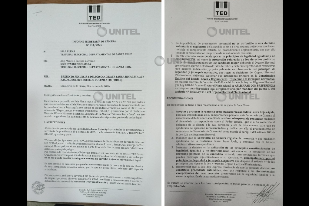 El Tribunal Electoral Departamental (TED) de Santa Cruz aceptó la renuncia de Laura Rojas a la candidatura a segunda concejal para el municipio de Santa Cruz de la Sierra por la agrupación Primero Santa Cruz, que es encabezada por Gary Añez.