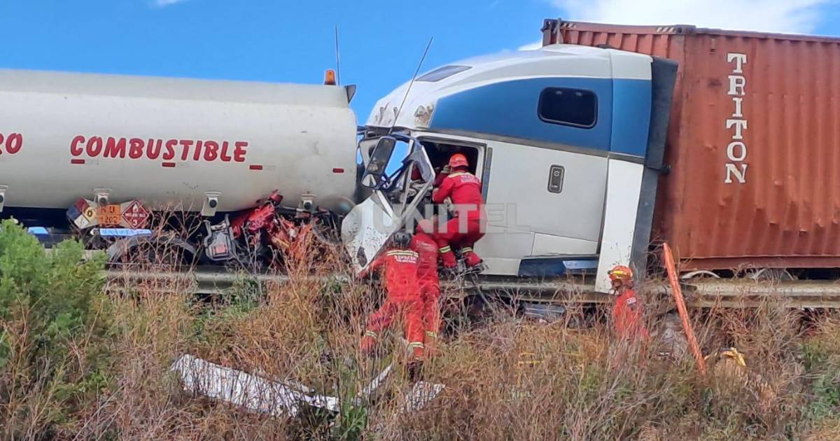 Bomberos de la Policía trabajar para liberar al conductor del tráiler, que tras el impacto aún está con vida. Por su lado, el chofer de la cisterna está a salvo. El accidente se registró en el kilómetro 26 de la carretera Santa Cruz y Cochabamba