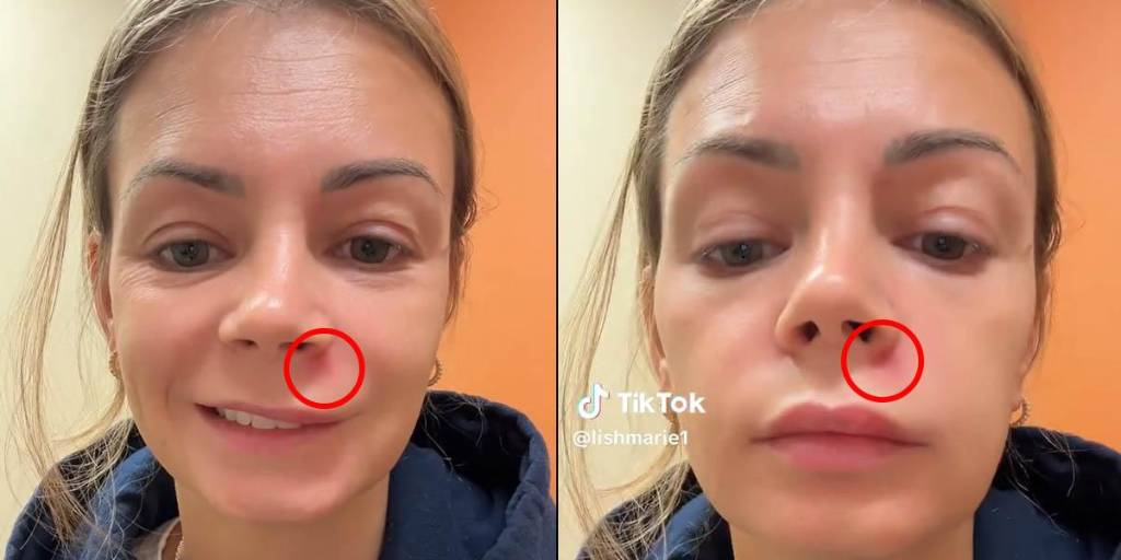 Todo comenzó un día cuando la joven identificada en TikTok como @lishmarie1, notó un grano debajo de una de sus fosas nasales, en el área comprendida entre la boca y el puente nasal, conocida entre médicos como el “triángulo de la muerte”.