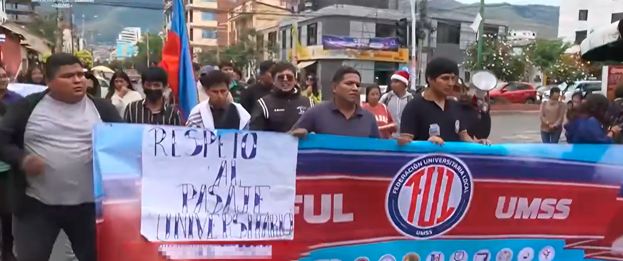 Estudiantes de la Universidad Mayor de San Simón (UMSS), pertenecientes a la Federación Universitaria Local (FUL), salieron a marchar por las calles de la ciudad de Cochabamba e iniciaron un bloqueo para mostrar su rechazo al incremento del pasaje de transporte público.