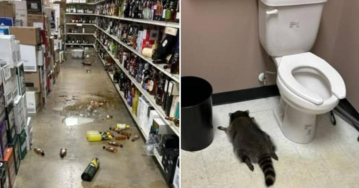 Video: Mapache causa estragos tras emborracharse en una licorería y queda dormido en el piso