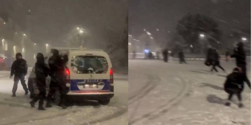 Un video en redes sociales muestra a agentes policiales, en La Rochelle, Francia, que hacen una pausa en su patrulla para unirse a jóvenes en una batalla bolas de nieve improvisada.